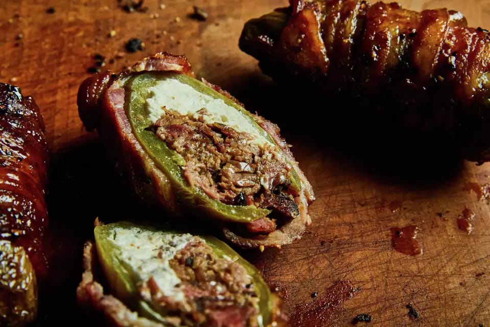 🐂 Signature item: Texas Twinkies—jalapeños stuffed with cream cheese and brisket, wrapped in bacon, and smoked to perfection.